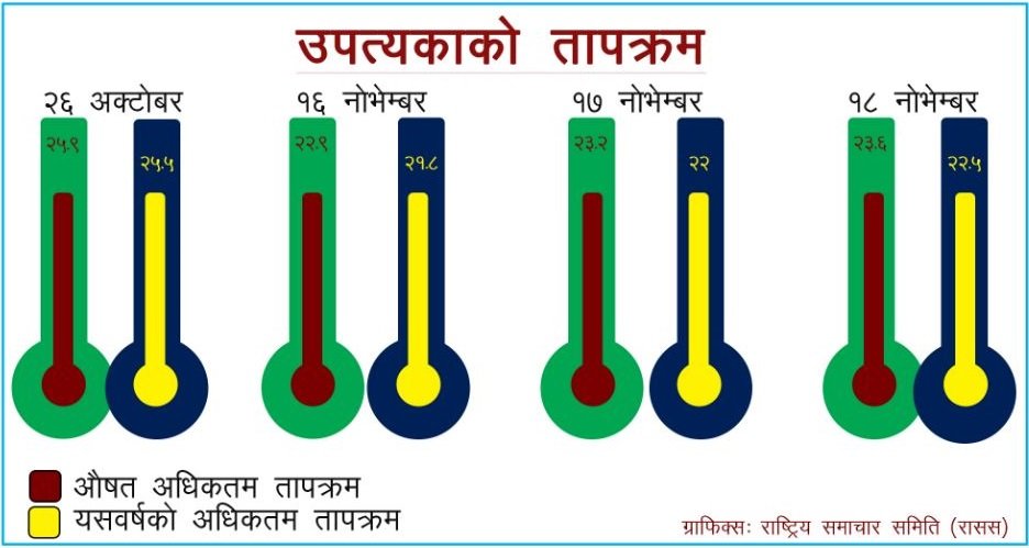 दुई दिन नोभेम्बर १७ (बुधबार) काठमाडौं उपत्यकाको अधिकतम तापक्रम (३ वर्षको औषत तापक्रम २३.२ डिग्री) हो । यसपालिको अधिकतम तापक्रम घटेर २२ डिग्रीमा झरेको छ । अघिल्लो वर्ष सोही दिन २२ दशमलव ६ डिग्री थियो । त्यसको अघिल्लो दिन नोभेम्बर १६ (मङ्गलबार) औषत अधिकतम तापक्रम २२ दशमलव ९ हो । त्यसदिन तापक्रम २१ दशमलव ८ डिग्रीमा झरेको जल तथा मौसम विज्ञान विभागले जनाएको छ । हिजो बिहीबार औषत तापक्रम २३ दशमलव ६ हो तर तापक्रम घटेर २२ दशमलव ५ मा आएको थियो ।