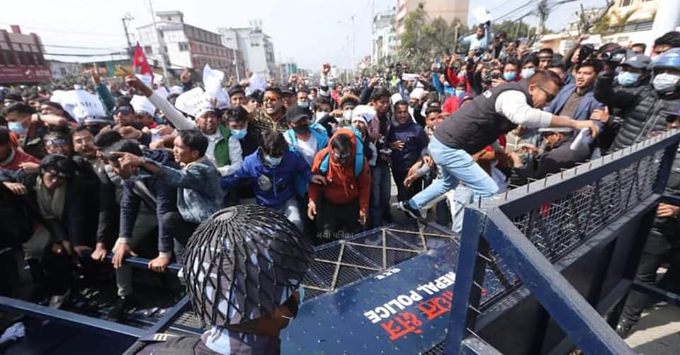 प्रदर्शनकारीहरू निषेधित क्षेत्र पार गर्न अगाडि बढेपछि प्रहरीले उनीहरूलाई बल प्रयोग गरेर हटाउने क्रममा घम्साघम्सी भएको हो । प्रदर्शनकारीहरूलाई प्रहरीले पानीको फोहोरा प्रहार गरेका छन् । प्रदर्शनकारीहरूले एमसीसी खारेज गर, एमसीसी चाहिँदैन लगायत नारा लगाएका छन् ।